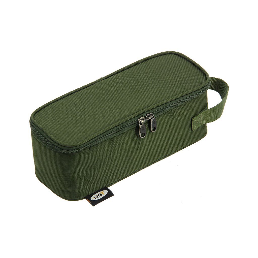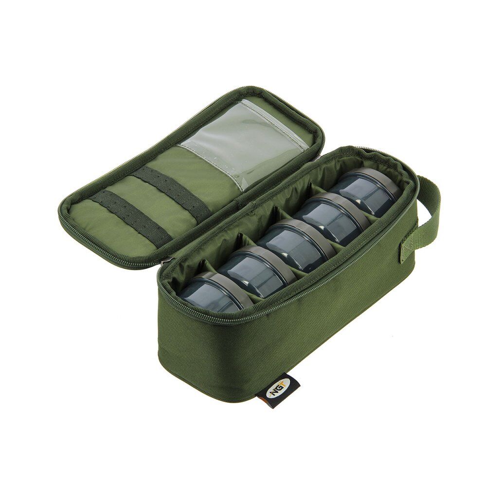 NGT levert een luxe Glug-tas van 600D polyester, inclusief vijf aascontainers, uitlekbakje, opbergruimte voor aasaccessoires en een draaggreep.