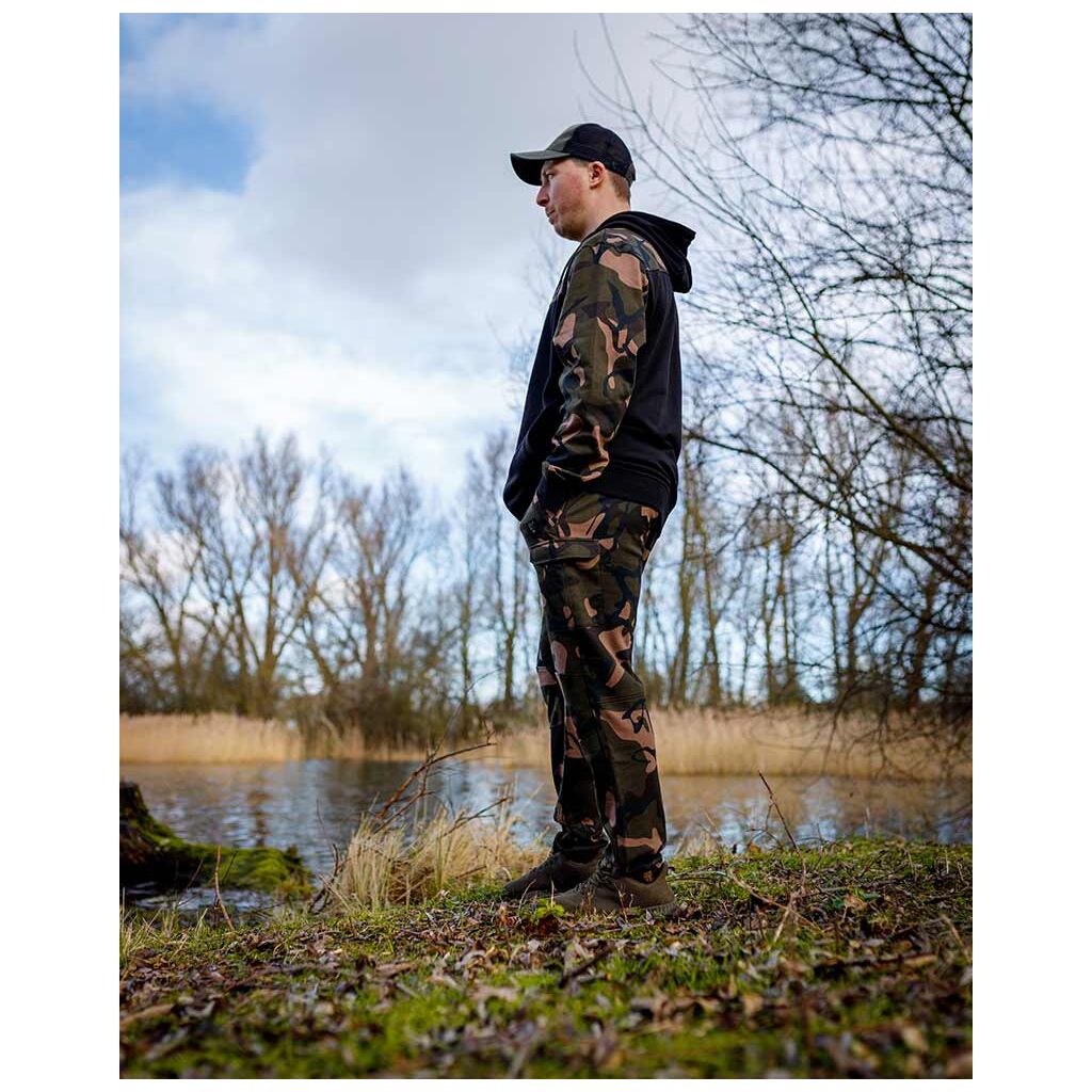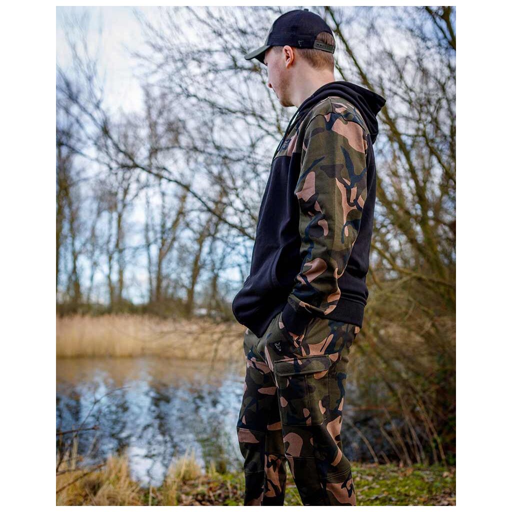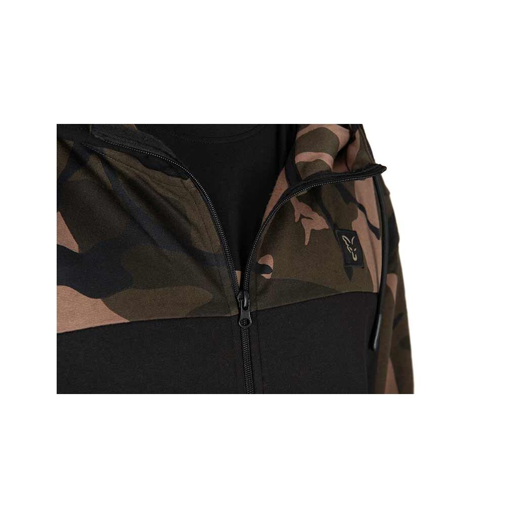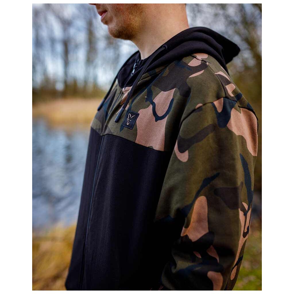 Ontdek de perfecte mix van stijl en functionaliteit met de Fox LW Black / Camo Split Zip Hoody, speciaal ontworpen voor fervente hobbyvissers.