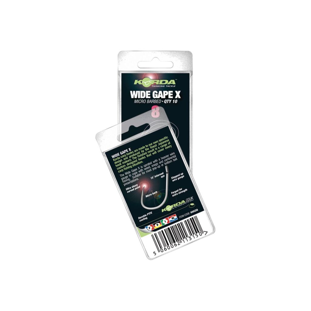 Door de jaren heen zijn talloze enorme karpers gevangen met de Korda Wide Gape Haak. Niet alleen Gareth Fareham van Team Korda heeft hem vaak genoeg als de perfecte haak beschreven, maar bijna elke karpervisser heeft dit model al in zijn tacklebox gehad. Danny Fairbrass van Korda Developments heeft echter niet stilgezeten en voortdurend gewerkt aan verbeteringen. Het resultaat van deze inspanningen is de Wide Gape X Haak! Hij is nog scherper, sterker en door zijn licht gewijzigde vorm nog agressiever en daarmee effectiever. Tijdens de testfase werd met deze haak een vis van 80 lb uit een zwaar bebost water geland. Als allround karperhaak voor zulke zware omstandigheden dekken de beschikbare maten bijna 100% van de situaties waarmee een karpervisser te maken krijgt. Alle eigenschappen die de Wide Gape X onderscheiden, zorgen ervoor dat meer aanbeten worden omgezet in effectieve runs, waardoor de vangsten toenemen.