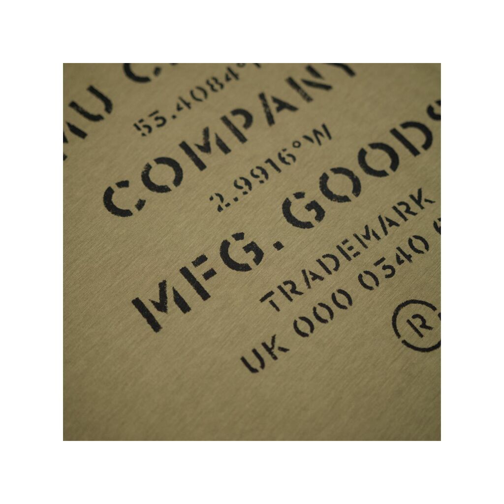 Een monochrome zeefdruk met een slijtage-effect op onze kenmerkende, lichte kaki kleur.