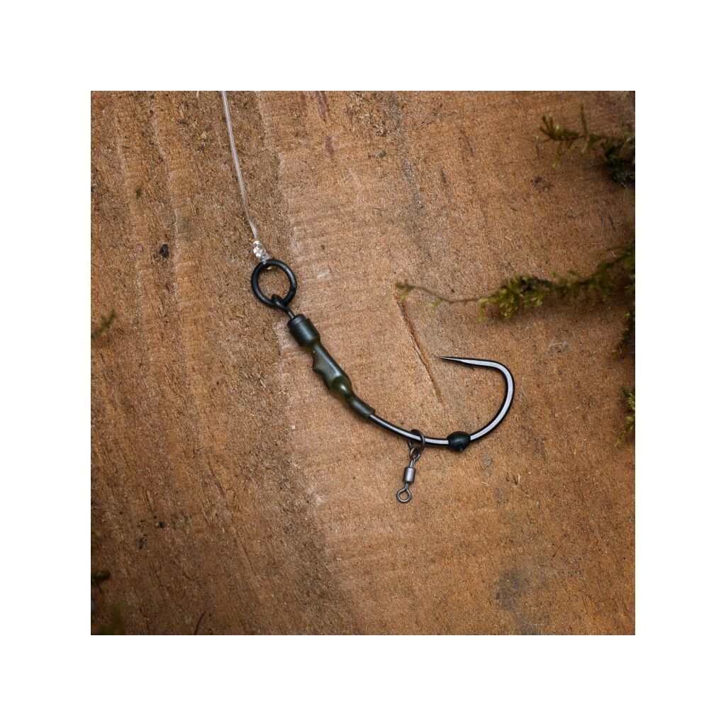 Een complete goed geknoopte Ronnie Rig voorzien van stijf onderlijn materiaal van 100% fluoro carbon. De Ronnie Rig Stiff is voorzien van een KD Curved haak bevestigd op een Ronnie Rig Swivel. Dit geheel is geknoopt aan 27lb Ghost Butterfly Fluoro Carbon. Hierdoor ontstaat een mooi stijf geheel wat snel zinkt en het geheel goed gestrekt houdt. Perfect voor schone bodems.