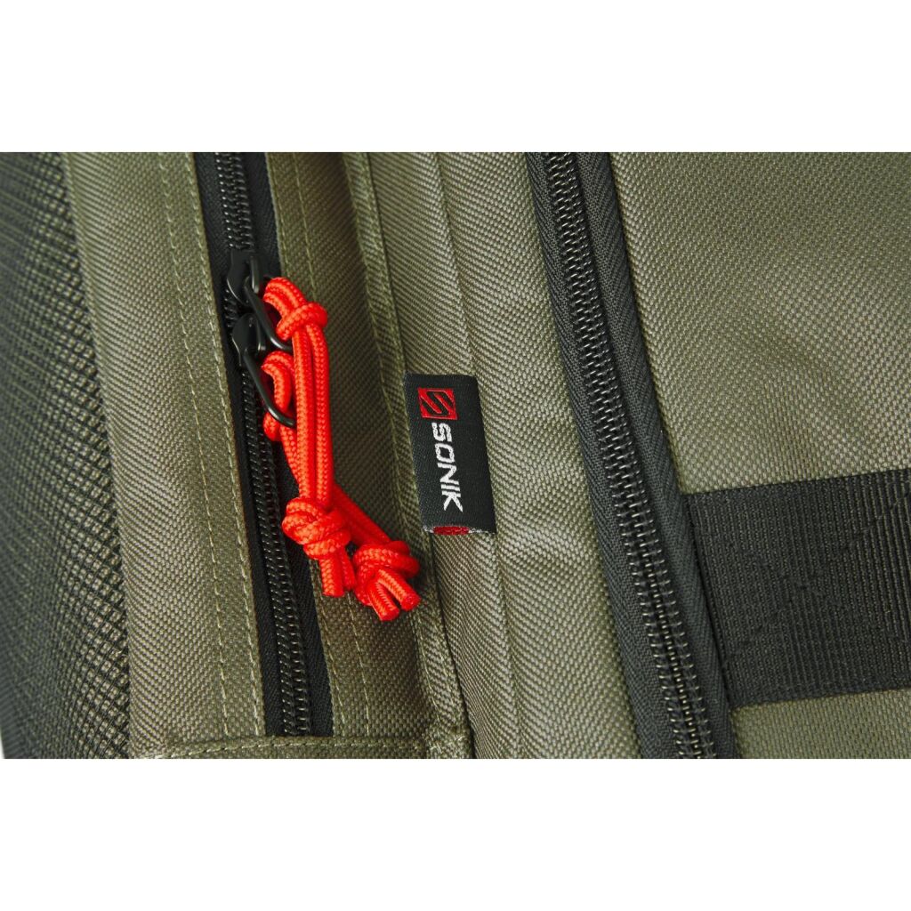 De Sonik Tackle Organiser Rucksack zit boordevol functies om jouw viservaring te verbeteren. Het bovenste ritspaneel onthult een uitneembaar rek dat geschikt is voor een middelgrote tackle-box, waardoor je snel en gemakkelijk toegang hebt tot je visgerei. Het hoofdvak kan eenvoudig volledig worden geopend via het zij-ingangsritspaneel. Twee grote zijvakken zijn compatibel met de meeste accessoiretassen en zijn voorzien van netvakken, die ook ideaal zijn voor banksticks en buzzer bars. Daarnaast is er een uitklapbaar vak dat perfect is voor het snel bereiken van essentiële benodigdheden. De rugtas beschikt over een goed gevoerd draagsysteem met borstriem voor extra comfort. Hij is vervaardigd uit robuust 600D-materiaal en heeft een waterdichte bodem.
